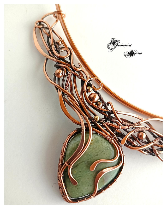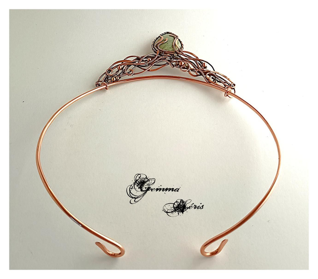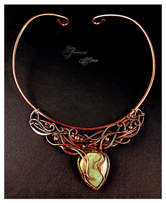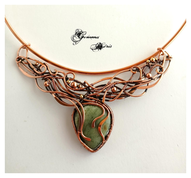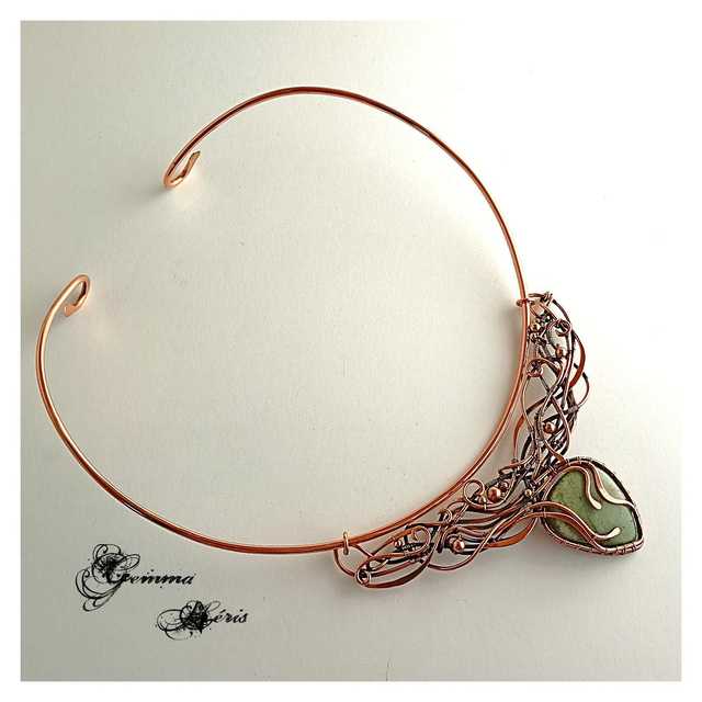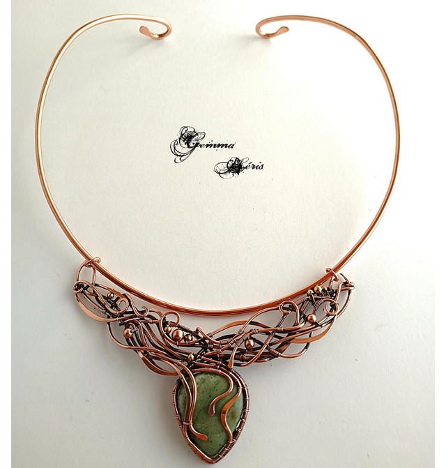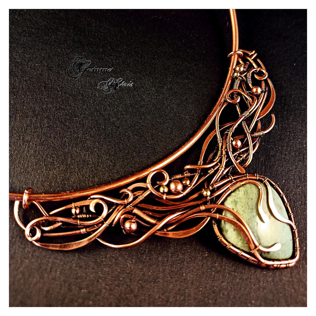 Ce collier unique est une véritable œuvre d’art où des fils de cuivre serpentent avec élégance, formant un entrelac complexe d’arabesques et de volutes. Sophistiqué sans être ostentatoire, ce bijou révèle un travail minutieux : les fils de cuivre sont formés, ciselés, et martelés pour évoquer l’image d’une jungle luxuriante. Les motifs délicats enveloppent et mettent en valeur un superbe cabochon d’aventurine verte, pierre naturelle aux reflets envoûtants. Le pendentif, délicatement mobile, est fixé à une tige ras de cou qui épouse gracieusement la base du cou, formant un collier harmonieux, ne nécessitant pas d'entretien, et parfait pour sublimer une tenue estivale.