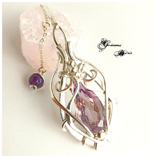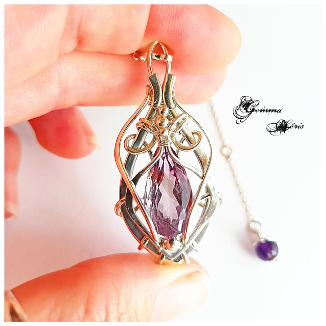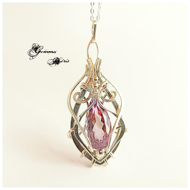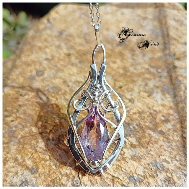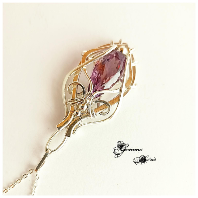 Pendentif réalisé en façonnant, martelant, formant, ciselant et en polissant des fils d'argent massif afin de les ajuster pour sertir un magnifique cabochon taillé d'améthyste de couleur pourpre léger. Je voulais faire ressortir cette transparence avec un entrelacs de fils aérés. Eos, car la couleur m'inspirais celle de l'aurore, qui dans le panthéon grec, est représentée par Eos, la déesse de l'Aurore. Ce pendentif est livré dans une boîte cadeau prête à offrir et monté sur une chaîne en argent massif, maille forçat, réglable de 43 à 47 cms grâce aux anneaux et se termine par une perle d'Amethyste qui orne la nuque.