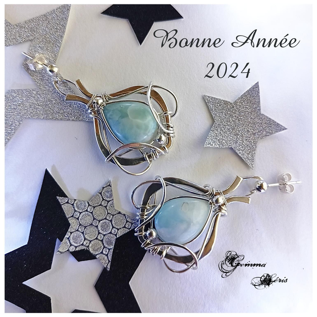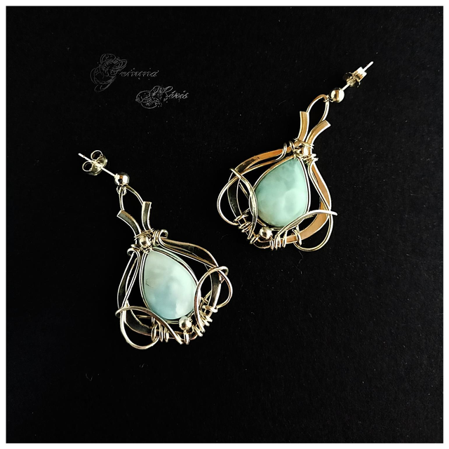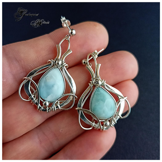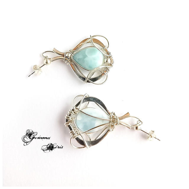 Boucles d'oreilles en fils d'argent massif martelés, ciselés, formés, polis entièrement à la main. Ces fils forment un entrelacs enserrant un cabochon de Larimar.