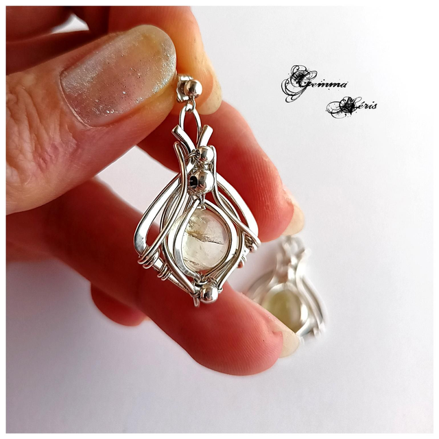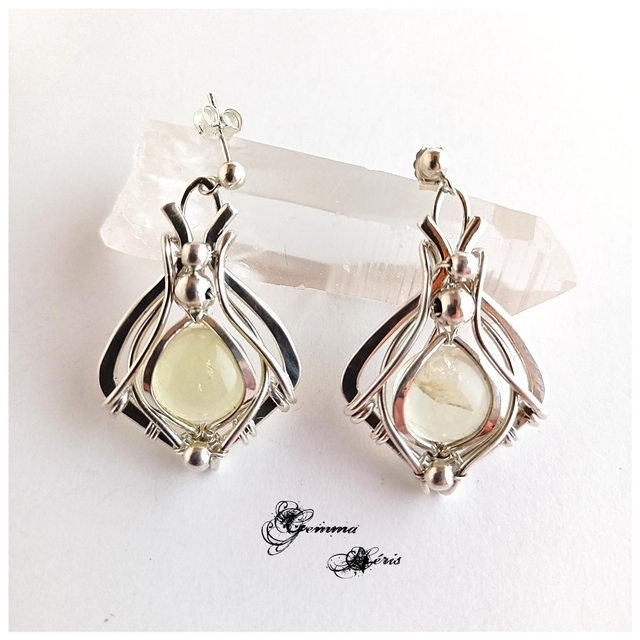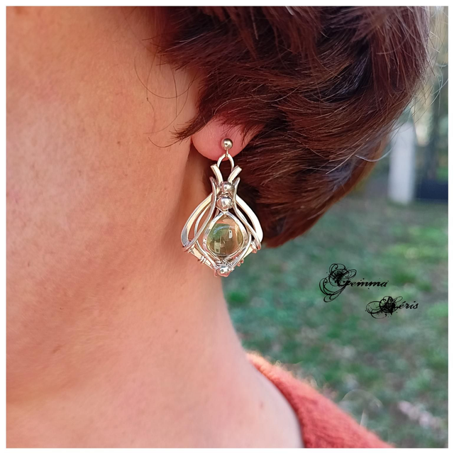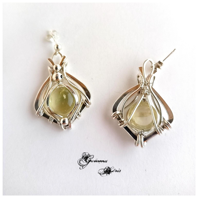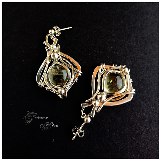 Boucles d'oreilles en fils d'argent massif qui sont martelés, ciselés, formés, et polis entièrement à la main et qui enveloppent un cabochon de Lemon quartz de 10 mms de largeur et d'une superbe transparence.