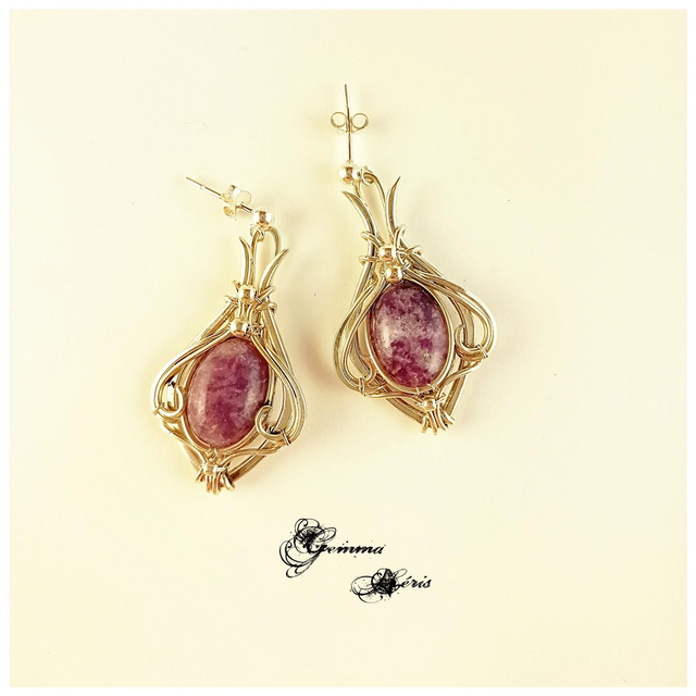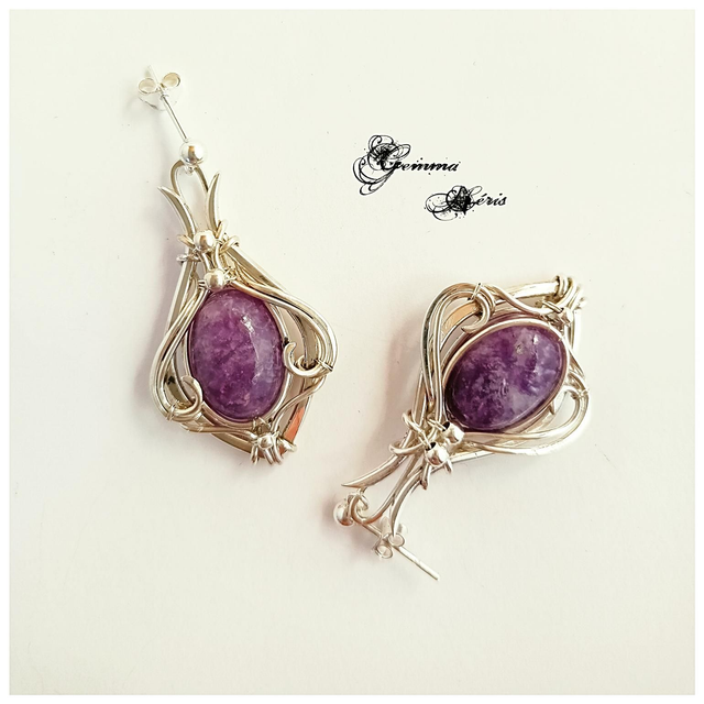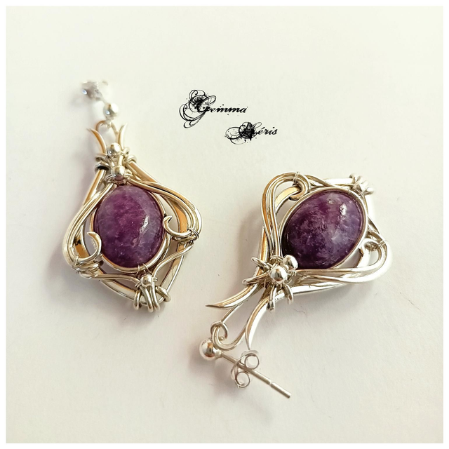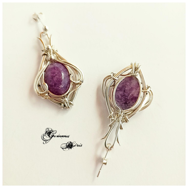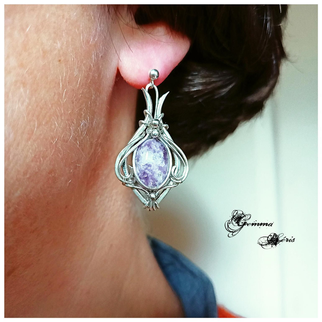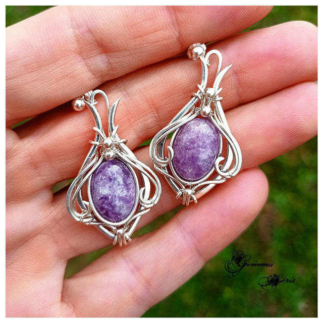 - Fabriquées en argent, elles mettent en valeur un cabochon ovale de lépidolite marbrée aux teintes douces d’aubergine et de blanc. Ce cabochon, entouré d’un fil d’argent fin formant une délicate couronne, capte la lumière et sublime chaque détail.
